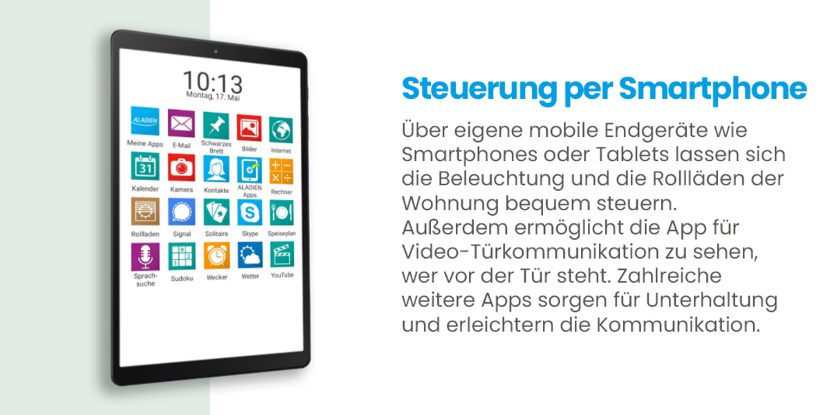 ALADIEN wird bereits seit 2017 in unseren WohnenPLUS-Residenzen und im Betreuten Wohnen der EHS eingesetzt. Ebenso unterstützt das System bereits in drei ambulant betreuten Wohngemeinschaften die Alltagsbegleiter bei der täglichen Betreuung. Das System wird fortlaufend weiterentwickelt und soll perspektivisch in allen Neubauten und sanierten Bestandsgebäuden zum Einsatz kommen.